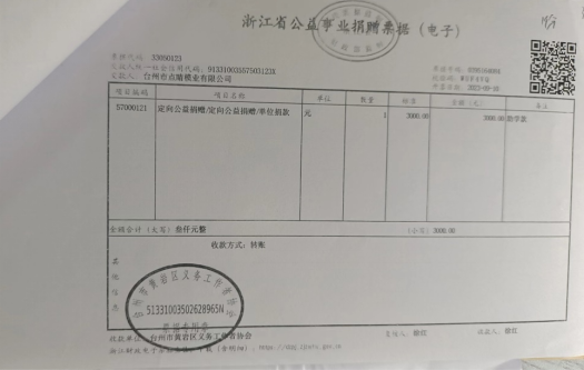 2023年9月10日,公司向臺州市黃巖區(qū)義務(wù)工作者協(xié)會捐贈3000元,幫助其更好的為社會服務(wù)。